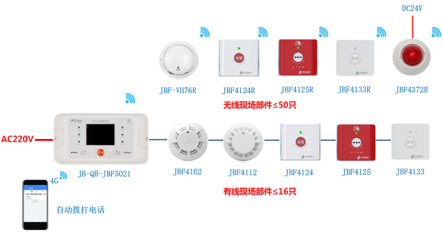 可通过无线传输方式接收无线现场部件的状态信息,支持最多50点无线现场部件连接,如无线感烟与无线可燃气体探测器、无线手动报警开关、无线输入模块等设备。通讯距离视距270m。