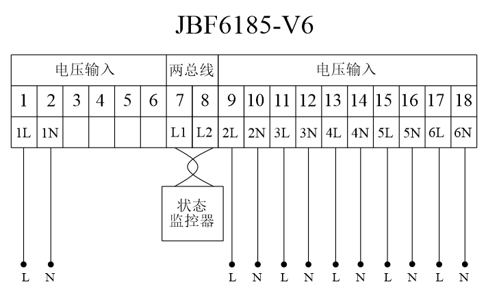端子(1,2)分别接入电源的交流电压(1L,1N)输入;端子(9,10)分别接入电源的交流电压(2L,2N)输入;端子(11,12)分别接入电源的交流电压(3L,3N)输入;端子(13,14)分别接入电源的交流电压(4L,4N)输入;端子(15,16)分别接入电源的交流电压(5L,5N)输入;端子(17,18)分别接入电源的交流电压(6L,6N)输入;