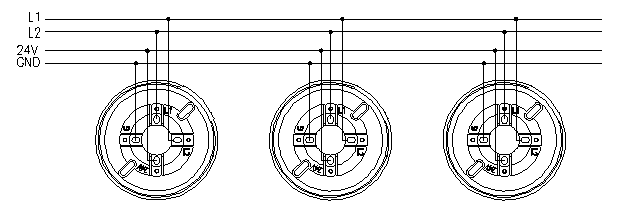 按探测器配套底座标识连接信号总线(L1、L2)和电源总线(24V,GND),信号总线不分极性,电源总线分极性,信号总线与电源总线不能短路、断路。