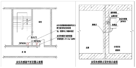 探测器宜安装在前室与消防通道间的墙壁上(高压侧),距顶棚0.5米处。