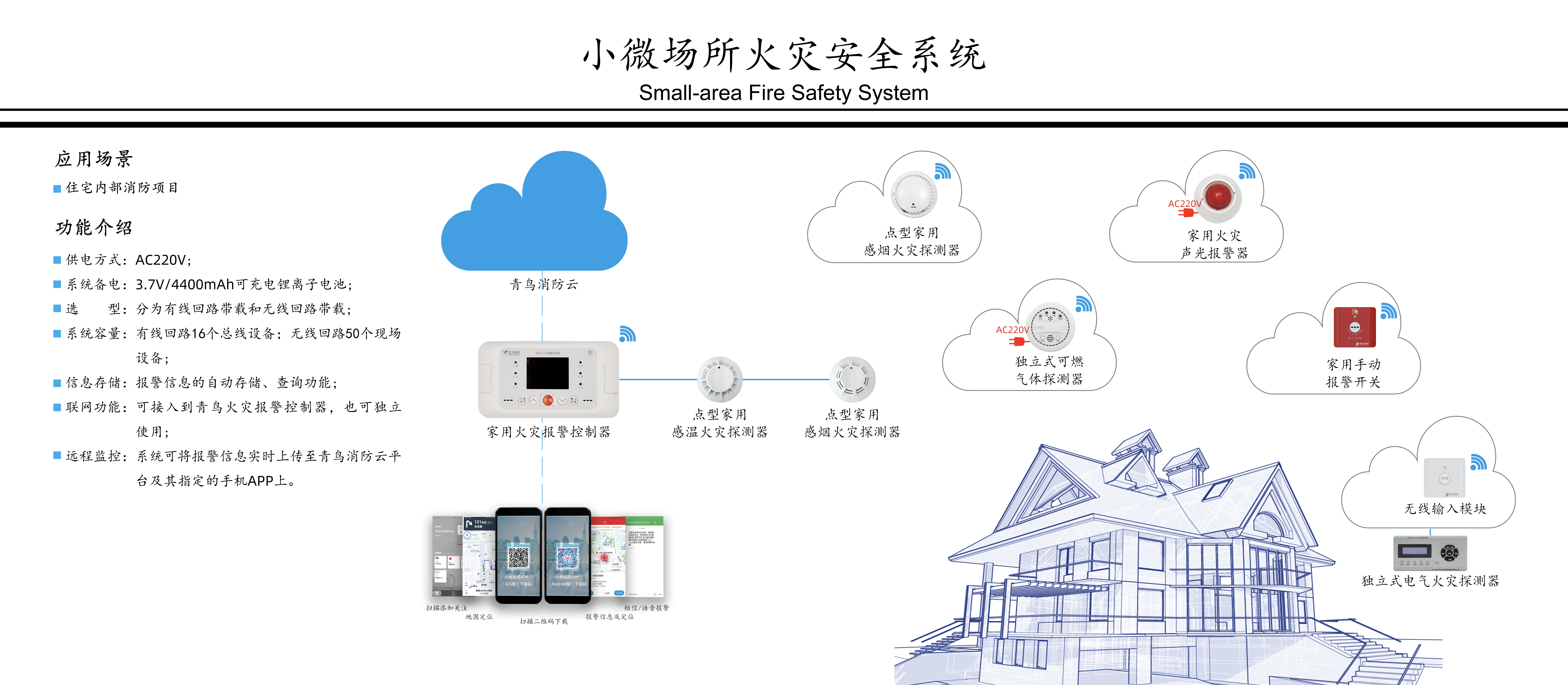 小微场所火灾安全系统是我公司针对广大住宅、九小场所等人员密集区域火灾安全防范而设计开发的火灾报警监控系统。该系统的设计和生产严格执行 GB22370-2008《家用火灾安全系统》国家标准,并获得中国强制认证证书(CCC)。项目现场可以通过有线和无线两种通讯方式将家用火灾报警控制器、家用感烟探测器、家用感温探测器、家用手动报警开关、可燃气体探测器、信号输入模块、输入输出模块、声光警报器等现场设备构建成一个小而全的火灾报警监控系统。