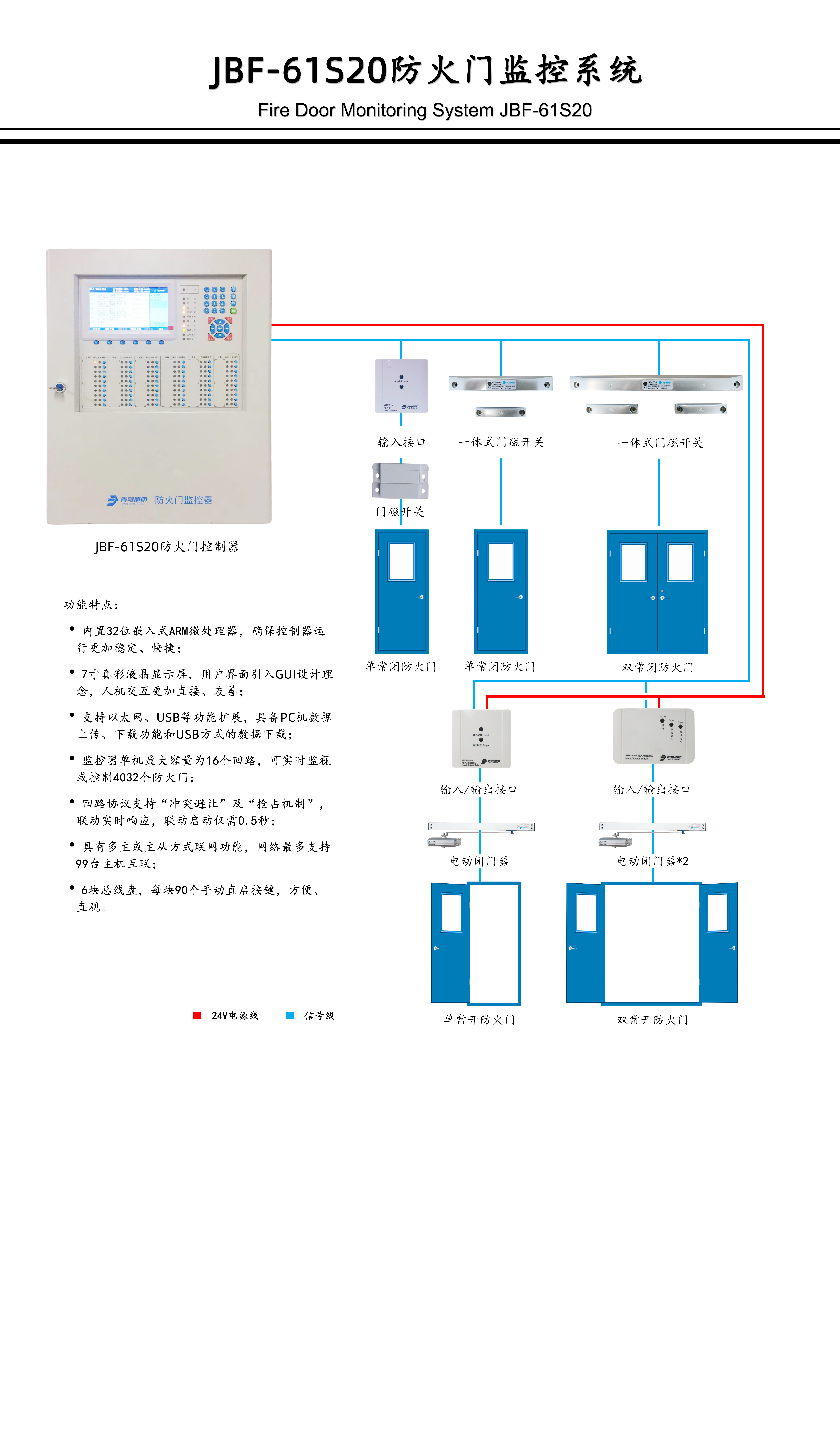 防火门监控系统由防火门监控器和现场接口组成,防火门监控器包括三个型号,分别为 JBF-61S20壁挂机、JBF-61S20-G柜式机、JBF-61S20-T台式机。现场接口主要包括 JBF6131-D、JBF6141-D、JBF6142-D、JBF6132-D、JBF6132-DS、JBF6145-D以及 JBF6146-D组成。