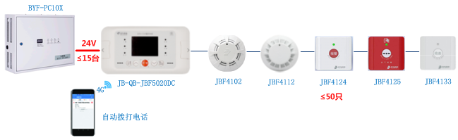BYF-PC10X电源:单台最多可连接15台家用火灾报警控制器 单台家用火灾报警控制器:1条总线回路,单回路50点 |