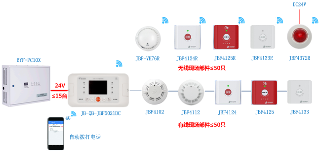 BYF-PC10X电源:单台最多可连接15台家用火灾报警控制器 单台家用火灾报警控制器: 1条总线回路,单回路50点;1条无线回路,单回路50点; |