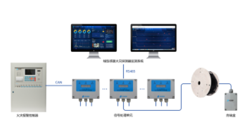 缆式线型感温火灾探测器具有丰富的对外通讯端口,可通过多种方式与上位机进行配给通讯。可以通过无源触点上传公共火警、故障信息;可以直接通过回路总线上传感温电缆的分布(或是分区报警信息),可通过RS485总线与感温电缆检测系统配接,上传感温电缆的各种属性信息、阈值设置信息、感温电缆感知到的现场实时温度信息,在检测平台上通过图形化的方式进行呈现;