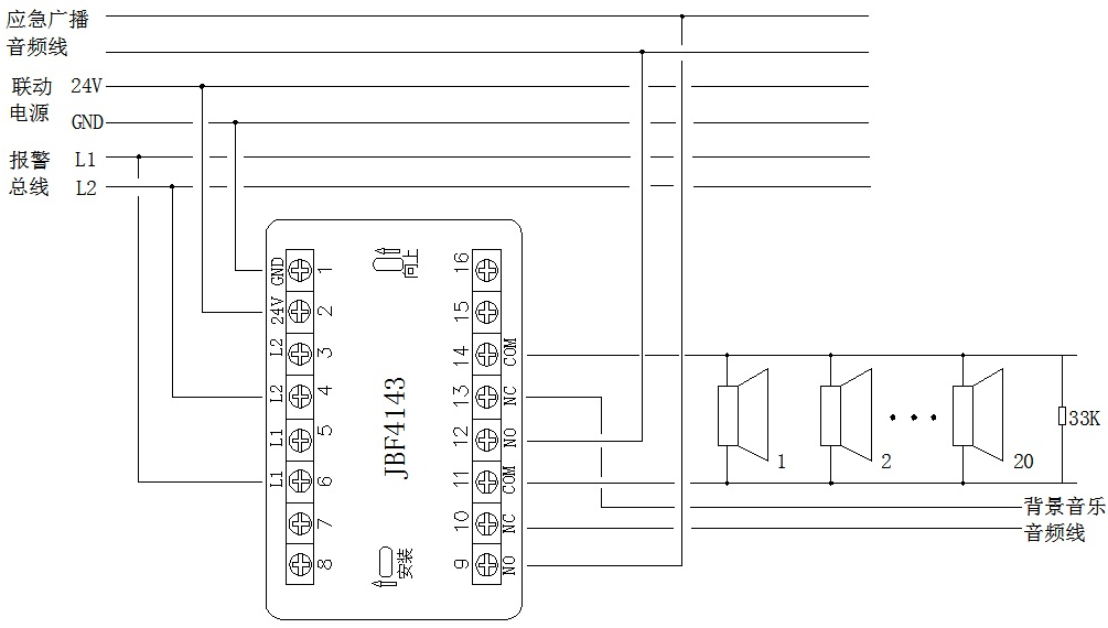 COM端子11与14为公共端,可接应急广播扬声器,末端需配接33KΩ终端电阻。