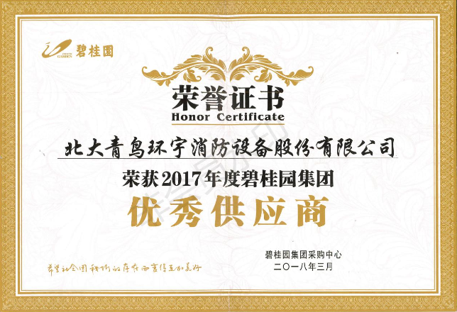 2018年3月20日,初春万物生长的季节,由碧桂园采购中心主办的碧桂园供应商大会在广东佛山盛大举行,在本次会议中碧桂园集团根据过去一年内质量、交期和服务等方面综合考量其不同区域和项目的供应商,并公开评分排名,在近万家供应商中评选出84家优秀企业授予“2017年度碧桂园集团优秀供应商”荣誉证书。青鸟消防凭借优质的服务,可靠的产品质量和性能,在碧桂园集团众多供应商中脱颖而出,荣膺这一殊荣。