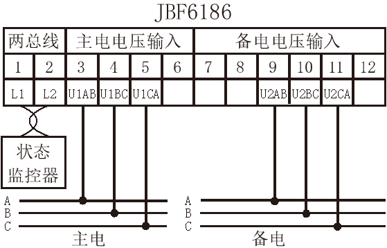 将被监视的双路消防电源的三根相线按照要求依次接入到传感器的U1AB,U1BC,U1CA和U2AB,U2BC,U2CA端子;