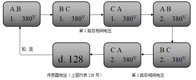 当传感器线路连接正常、监测电压正常情况下,传感器液晶屏将轮显目前每一路的监测电压值及本传感器在回路中所占地址,如下图: