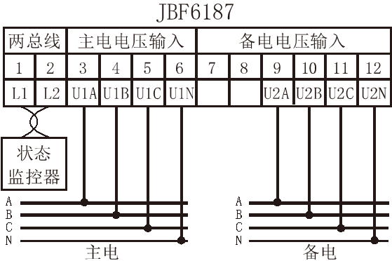 将被监视的双路消防电源的三根相线按照要求依次接入到传感器的U1A、U1B、U1C、U1N和U2A、U2B、U2C、U2N端子;