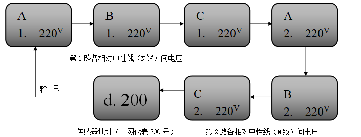 当传感器线路连接正常、监测电压正常情况下,传感器液晶屏将轮显目前每一路的监测电压值及本传感器在回路中所占地址,如下图: