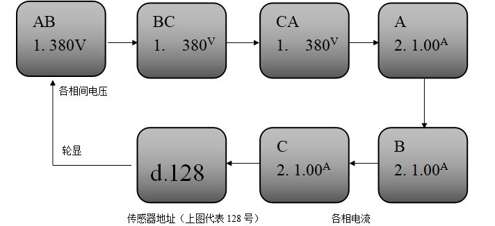 当传感器线路连接正常、监测电压正常情况下,传感器液晶屏将轮显目前每一路的监测电压值、电流值及本传感器在回路中所占地址,如下图: