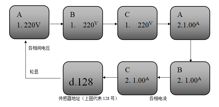 当传感器线路连接正常、监测电压正常情况下,传感器液晶屏将轮显目前每一路的监测电压值、电流值及本传感器在回路中所占地址,如下图: