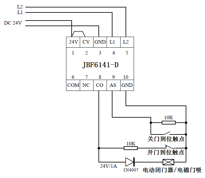 AS(端子9)、GND(端子10)连接电动闭门器等设备的关门到位信号(无源触点);