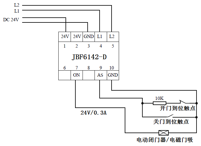 AS(端子9)、GND(端子10)连接电动闭门器上的关门到位信号(无源触点);